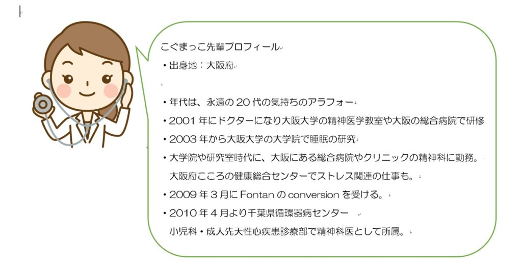 こぐまっこ先輩であって、現役ドクターとして頑張ってらっしゃる先生を囲んで、前半は、先生の経験をまじえ、先天性心疾患を持つ人の精神心理的な課題を講演してもらい、後半は、心理に詳しい先生だからこそ聞いてみたいこと、こぐまっこ先輩だからこそ聞いてみたいことを座談会風にみんなでおしゃべりできればと思います。多くの方のご参加お待ちしてます。